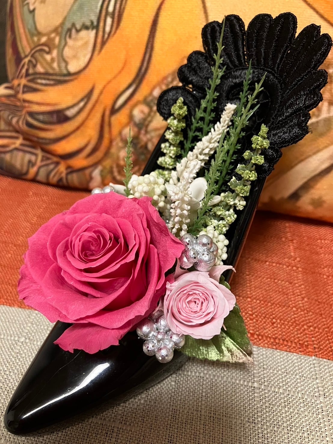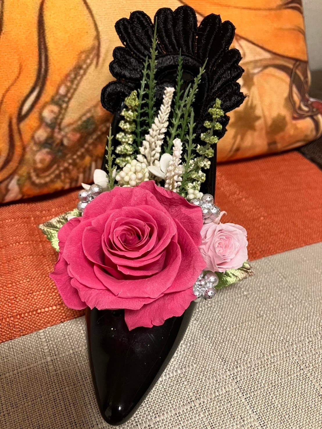 プリザーブドローズのハイヒールアレンジ(ブラックxローズピンク)